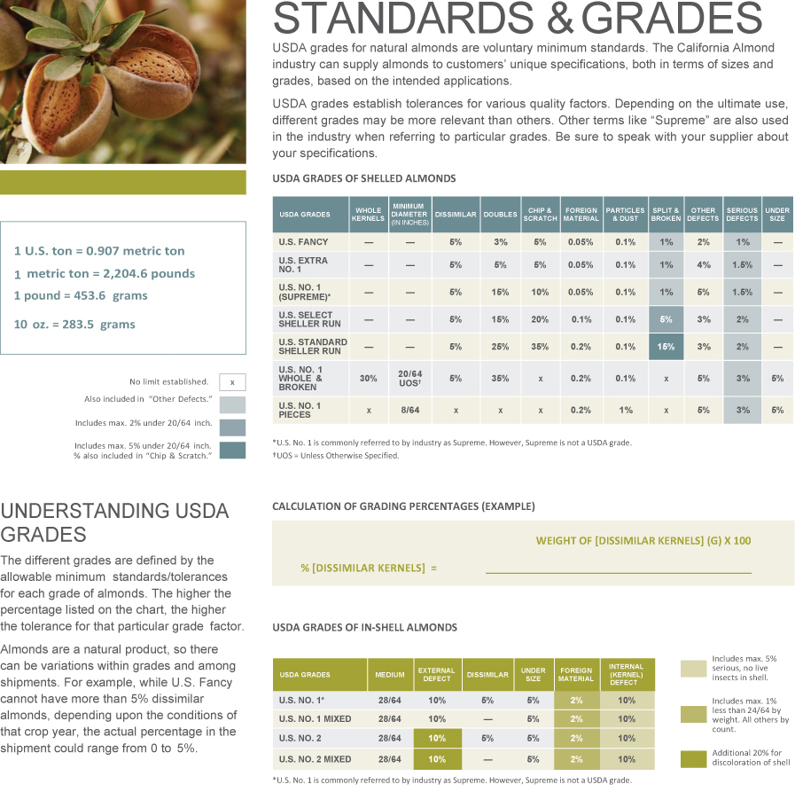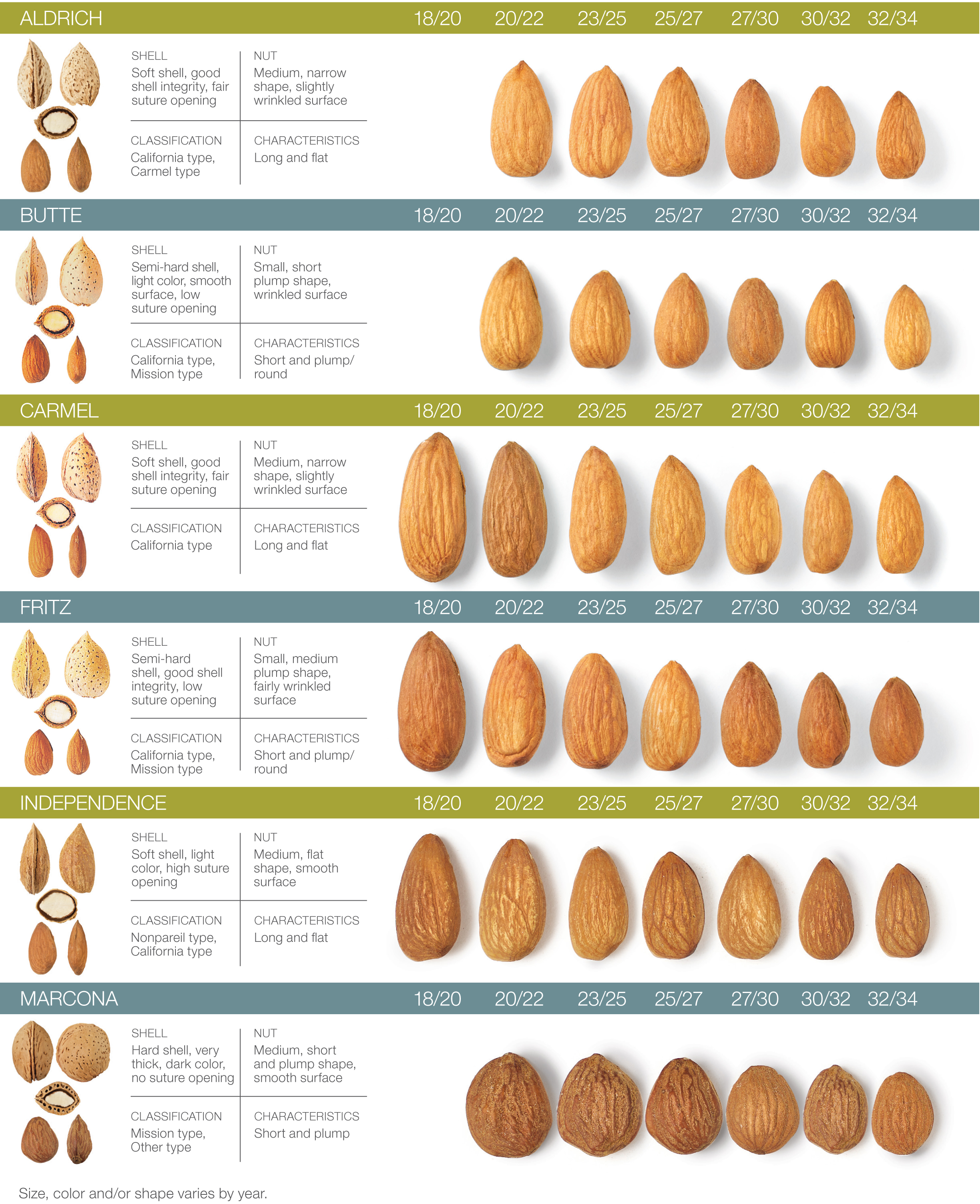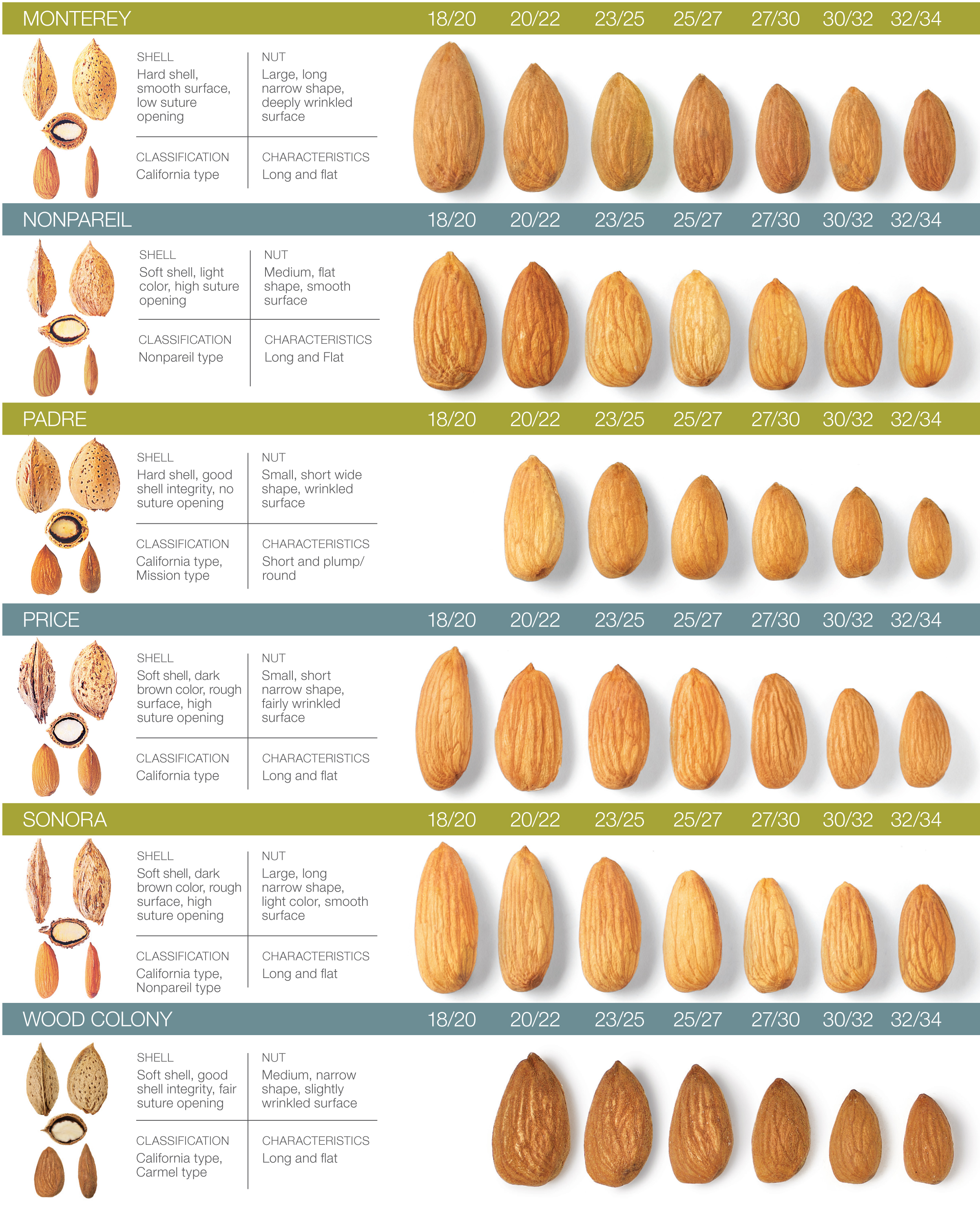 Since ancient times, almonds have been prized throughout the world for their delicious taste, crunchy texture and, increasingly, for their nutritional value. California is the world’s largest producer of almonds. With its ideal growing conditions, including a mild climate (hot dry summers and cool rainy winters), rich soil and abundant sunshine, this area produces about 80% of the global almond supply, exporting to nearly 90 countries. To ensure a consistent, high-quality, wholesome product year-round, state-of-the-art equipment and specialized techniques for growing, harvesting, processing and packaging are used. The California Almond industry respects the environment and keeps consumer health in mind, with food safety and quality assurance programs in the orchard and in processing and packaging. California Almonds are highly versatile and available in numerous varieties and forms suitable for diverse product applications. Use this guide to help determine the most suitable variety, size, form and grade of almond for your needs.